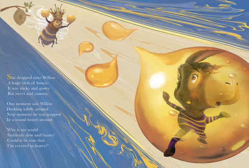Willow jumps out of bed, literally bursting with a million ideas of all the things he was going to get up to that day. He sets off in a mad rush, creating chaos and ruckus everywhere he goes. As he runs about like a headless chook, the queen been decides to teach him a little lesson. She encases him in a big blob of honey and it is what finally gets him to slow down and start taking things at a much gentler pace.